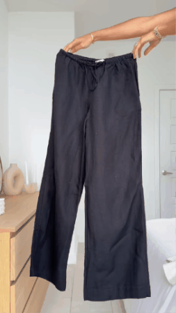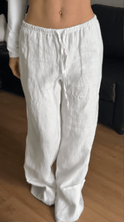 Nuestro pantalón de lino es perfecto para los días de calor. Su cintura elástica se adapta cómodamente a cualquier figura, brindando un calce holgado sin perder elegancia.